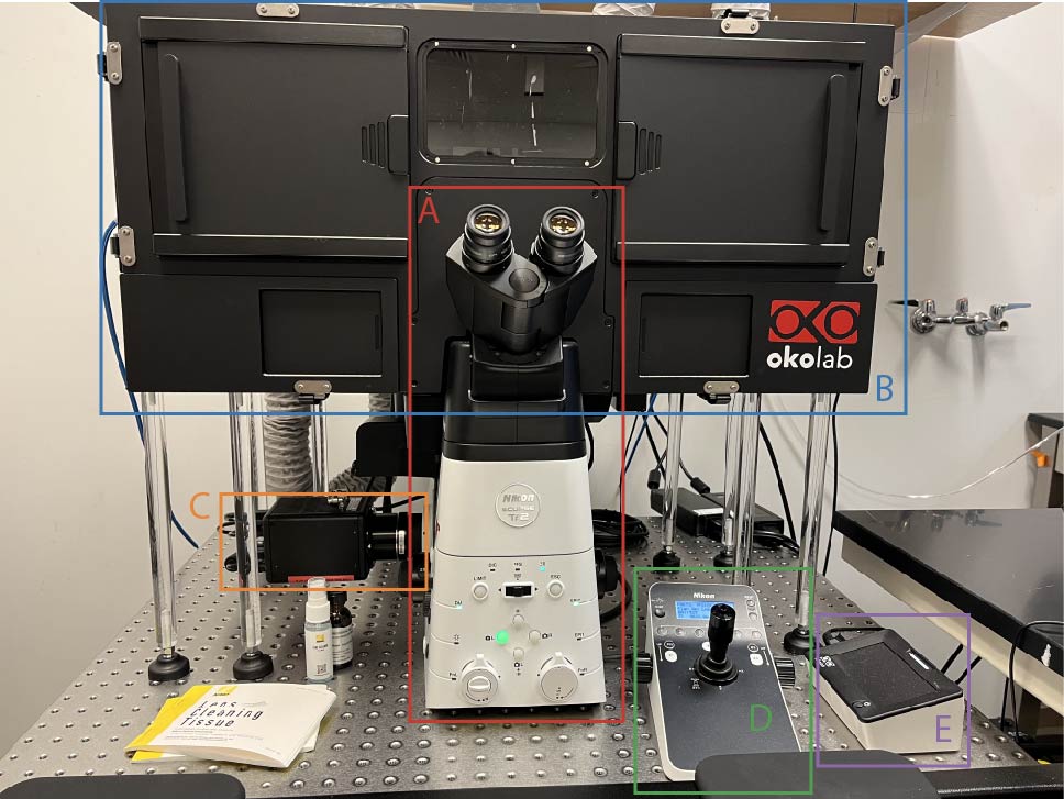 A (red): Main body of the microscope, B (blue) Okolab incubation chamber, C (orange): Digital camera, D (green): Joystick/Display, E (purple): Okolab controller display