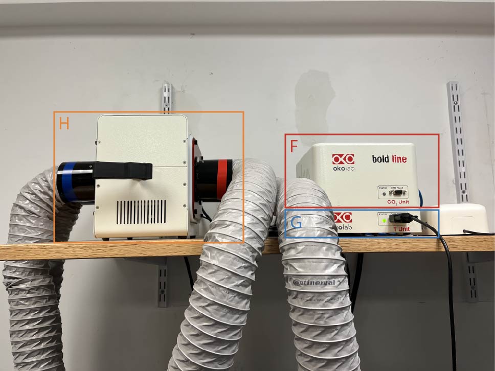 F (red): Incubator CO2 unit, G (blue): Incubator temperature unit, H (orange): Incubator heating box