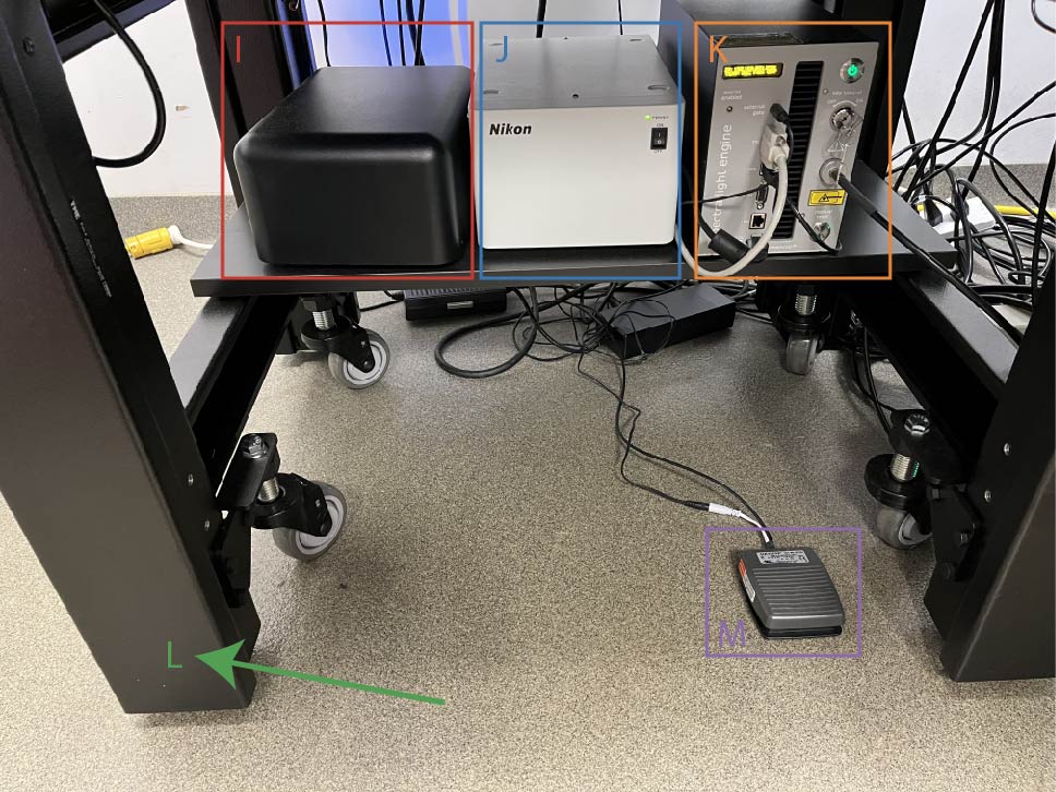 I (red): Digital camera controller, J (blue): Microscope controller, K (orange): Epifluorescence light source, L (green): Air table (compressor not pictured), M (purple): Incubation chamber light switch