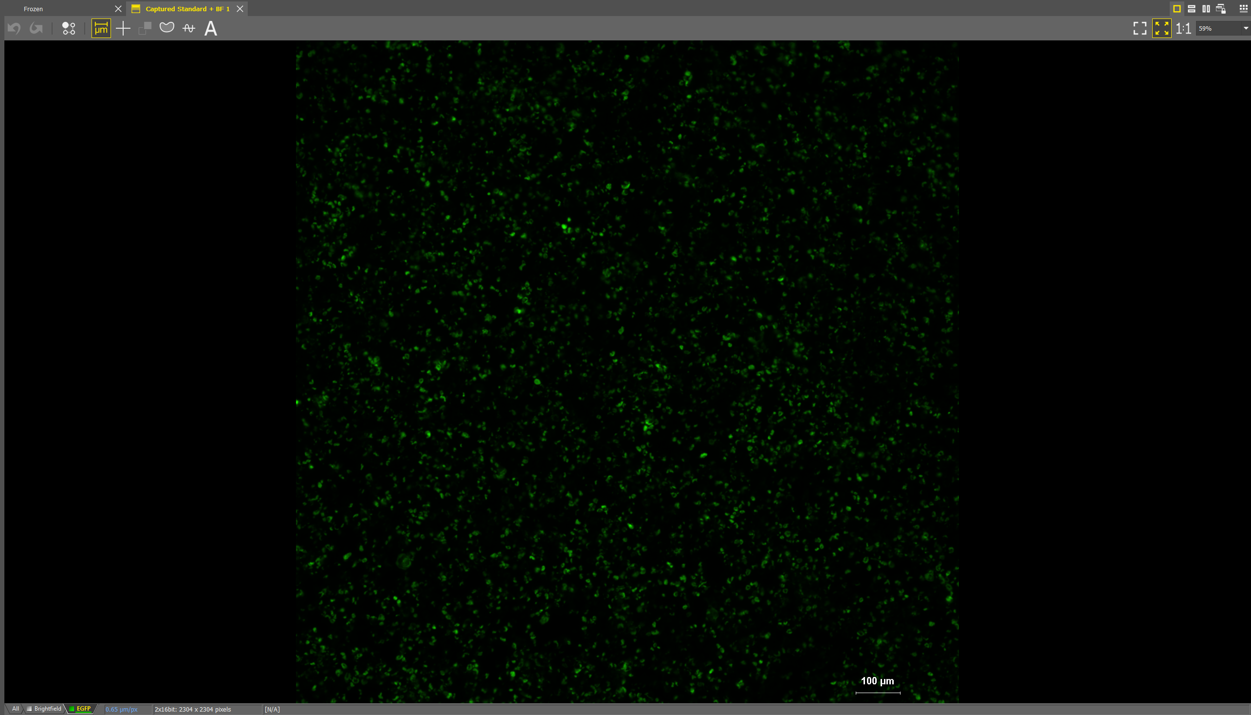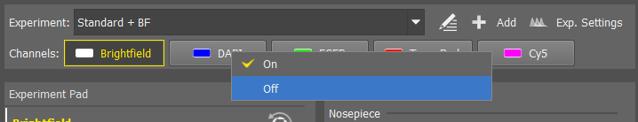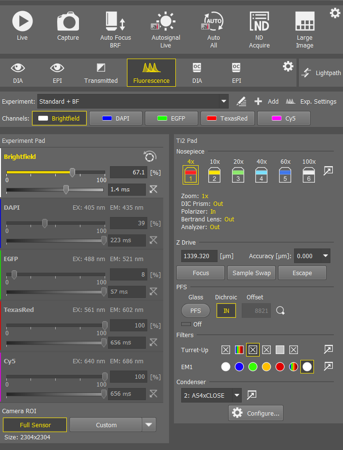 The panel on the right has the controls for optical configuration (which channels are active), exposure times, light intensities, and objectives. To capture a simple image with Brightfield and fluorescence choose “Standard + BF” from the dropdown menu.