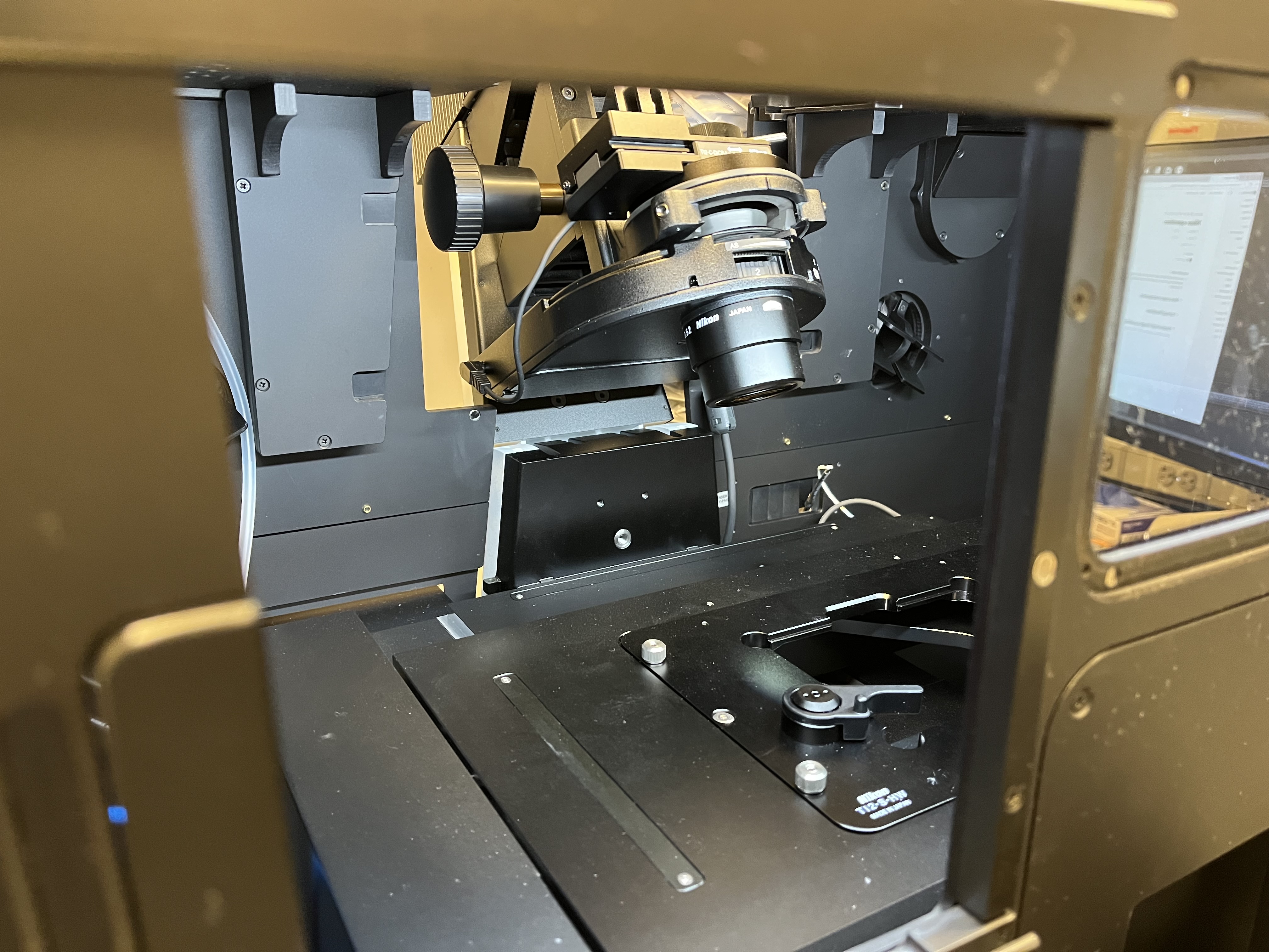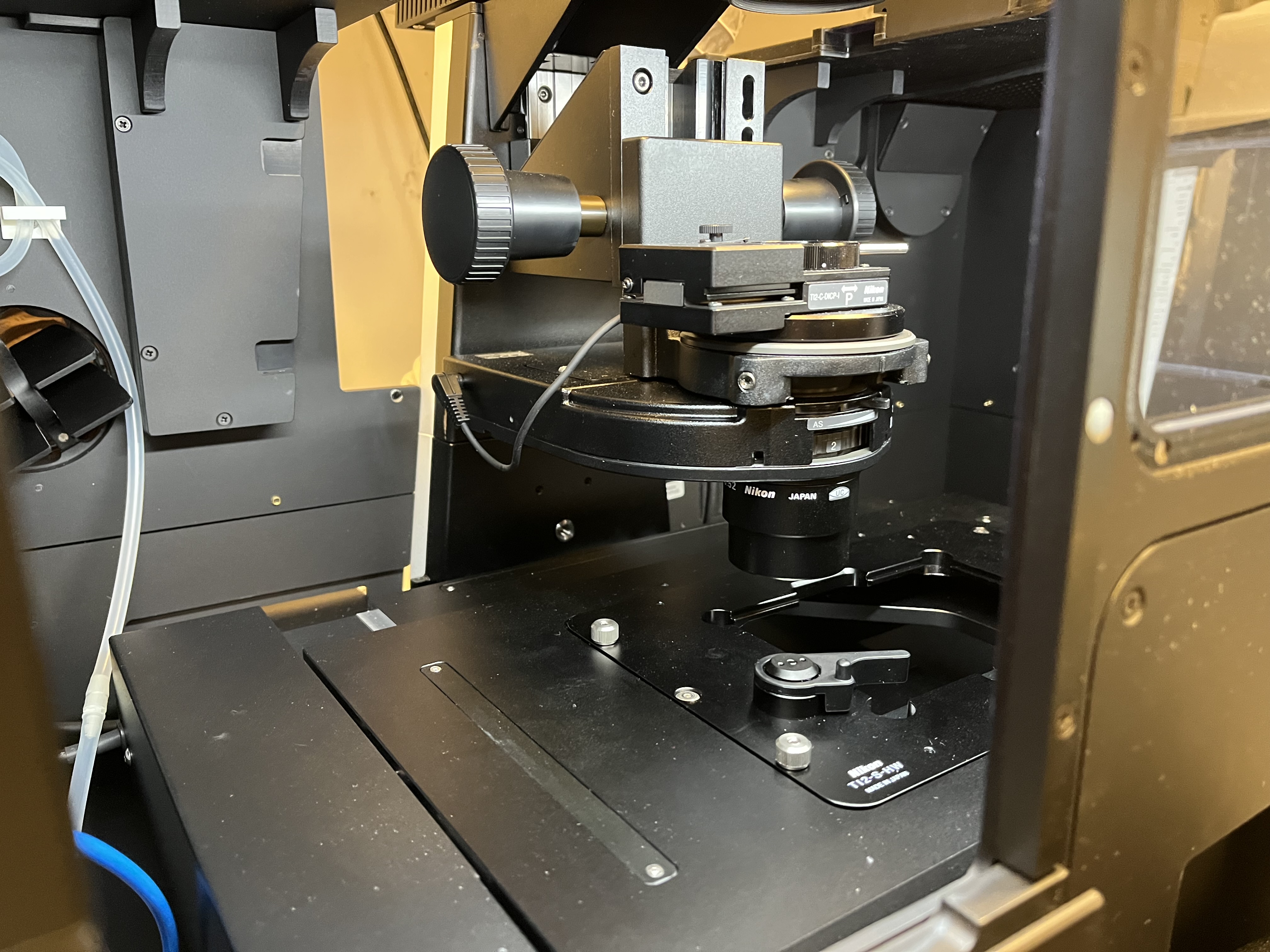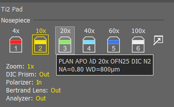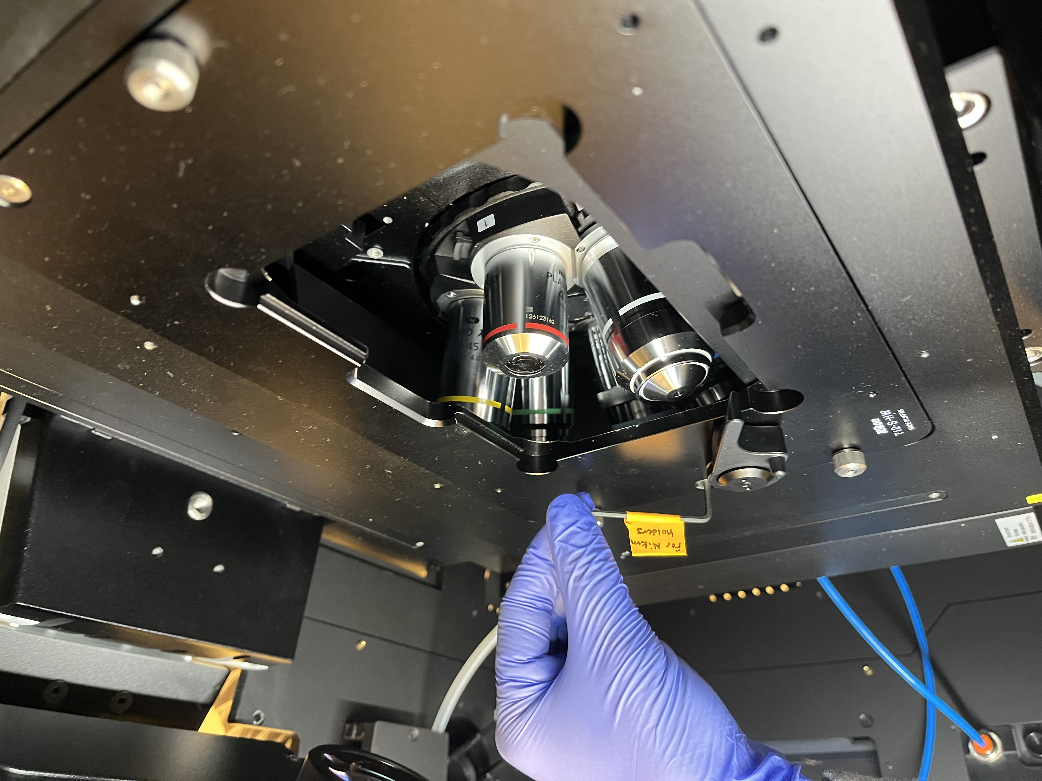 Choose the appropriate plate holder for your sample (TI2-S-HW for well plates and TI2-S-HU for slides and other plates). The Okolabs plate holders should only be used for timelapse imaging. If you must change the plate holder, move the objectives to the lowest z-level by hitting the “ESC” button on the front of the microscope. This prevents the objectives from being damaged. Carefully tighten the six screws (three by hand and three with the labeled Allen wrench). Press the “ESC” button again to return the objectives to their previous position.