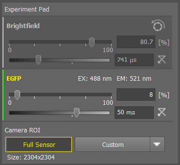 Hit “Auto All” to autofocus and autosignal all channels. This works the best with your highest expressing condition. Importantly, this sets the parafocality offsets for each channel, which ensure all your channels are in focus. Alternatively, you can select a single channel and individually perform “Auto Focus” or “Autosignal”. You can also manually set lightsource power and exposure times for each channel.