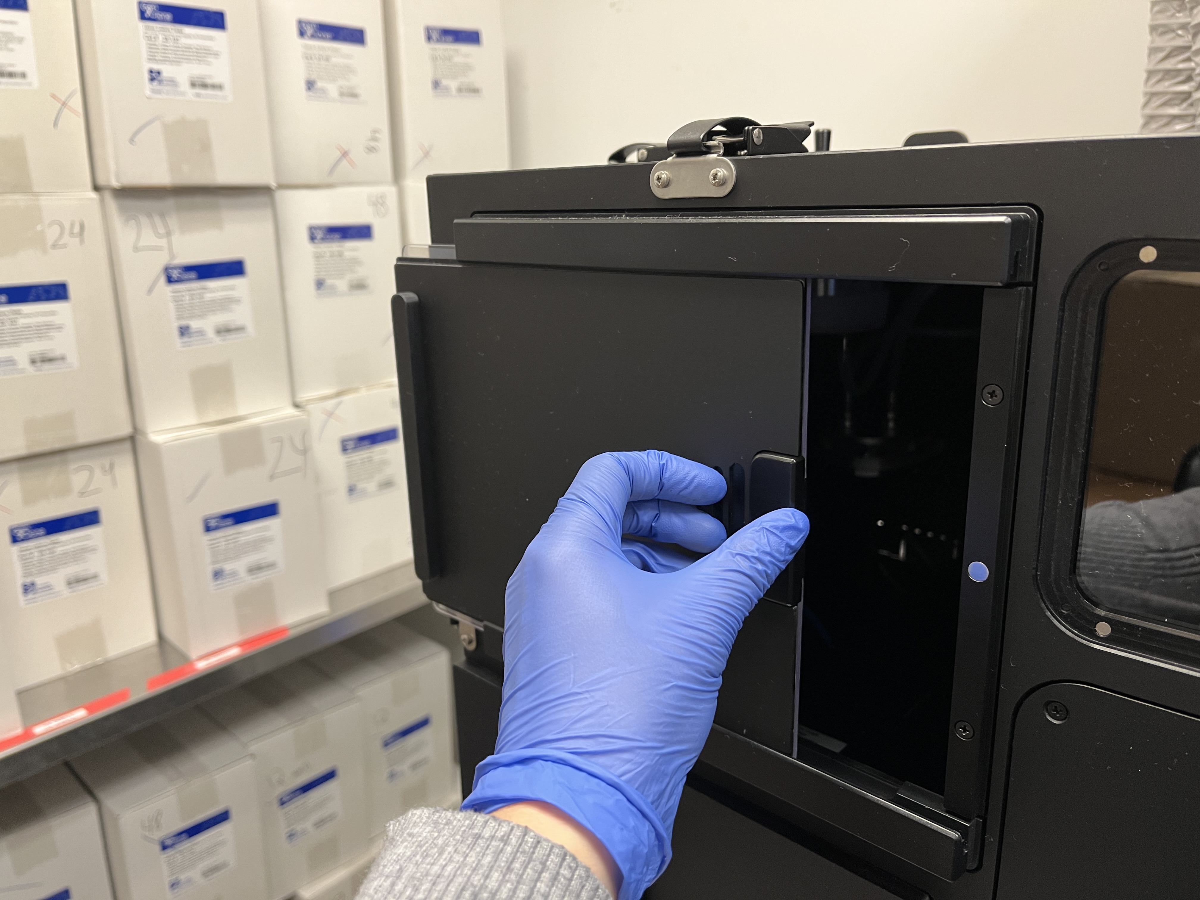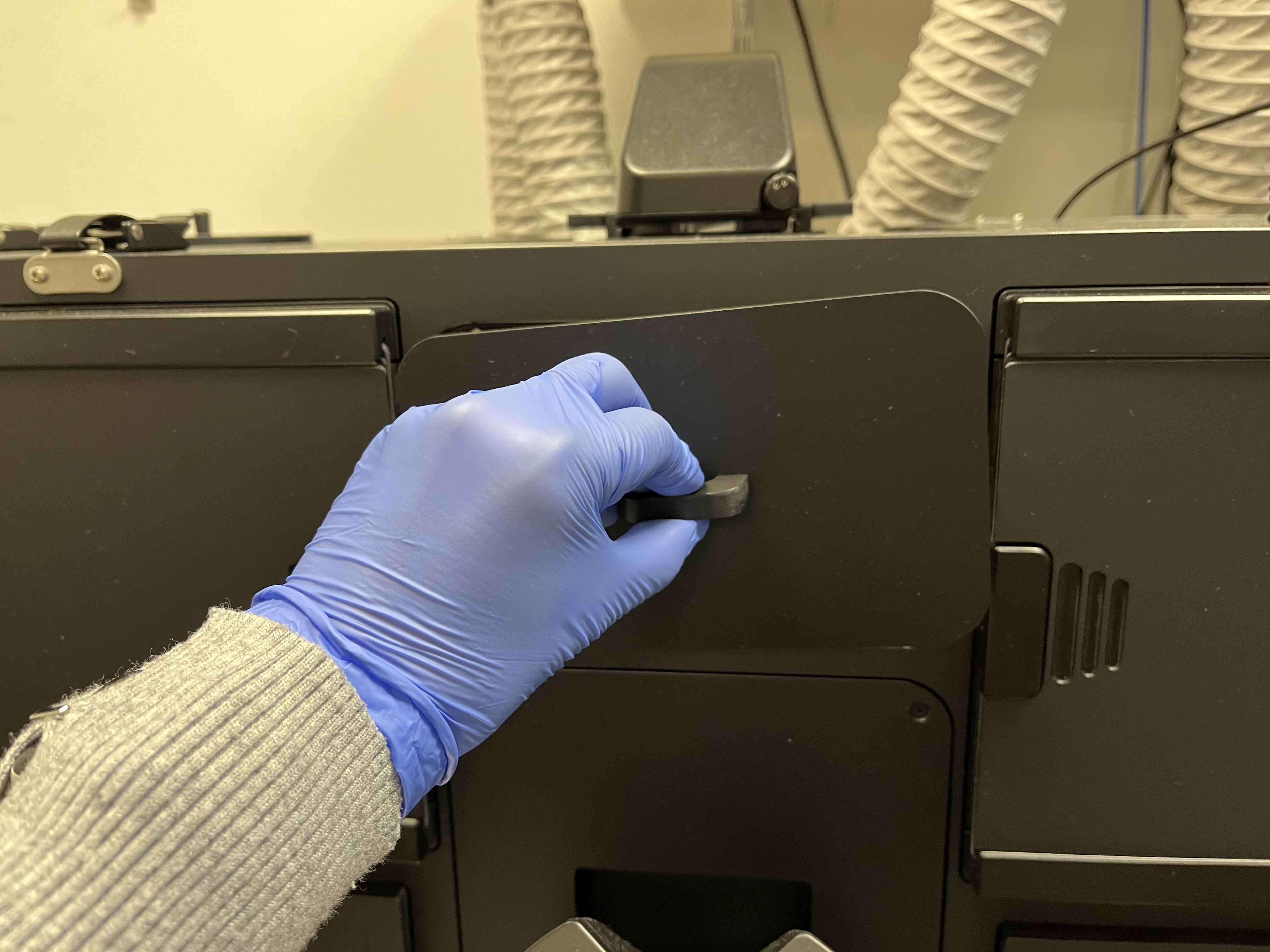 Remove the magnetic cover from the front window of the enclosure. Slide open the front left and right doors to facilitate bringing samples inside the enclosure. Slide open the top covers around the microscope to allow the microscope pillar to tilt back. You may use the foot pedal to turn on the light inside the enclosure, but be sure to turn this off when imaging.