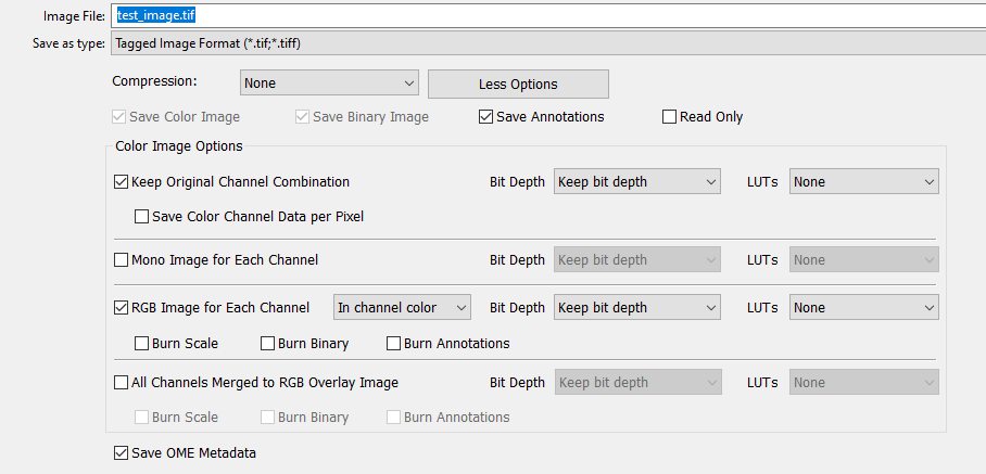 You may also save as a .tif file. This will create a multipage .tif containing the individual channel images. You can additionally save .tif files of individual channels by selecting “RGB Image for Each Channel” and an overlay by “All Channels Merged to RGB Overlay Image.”