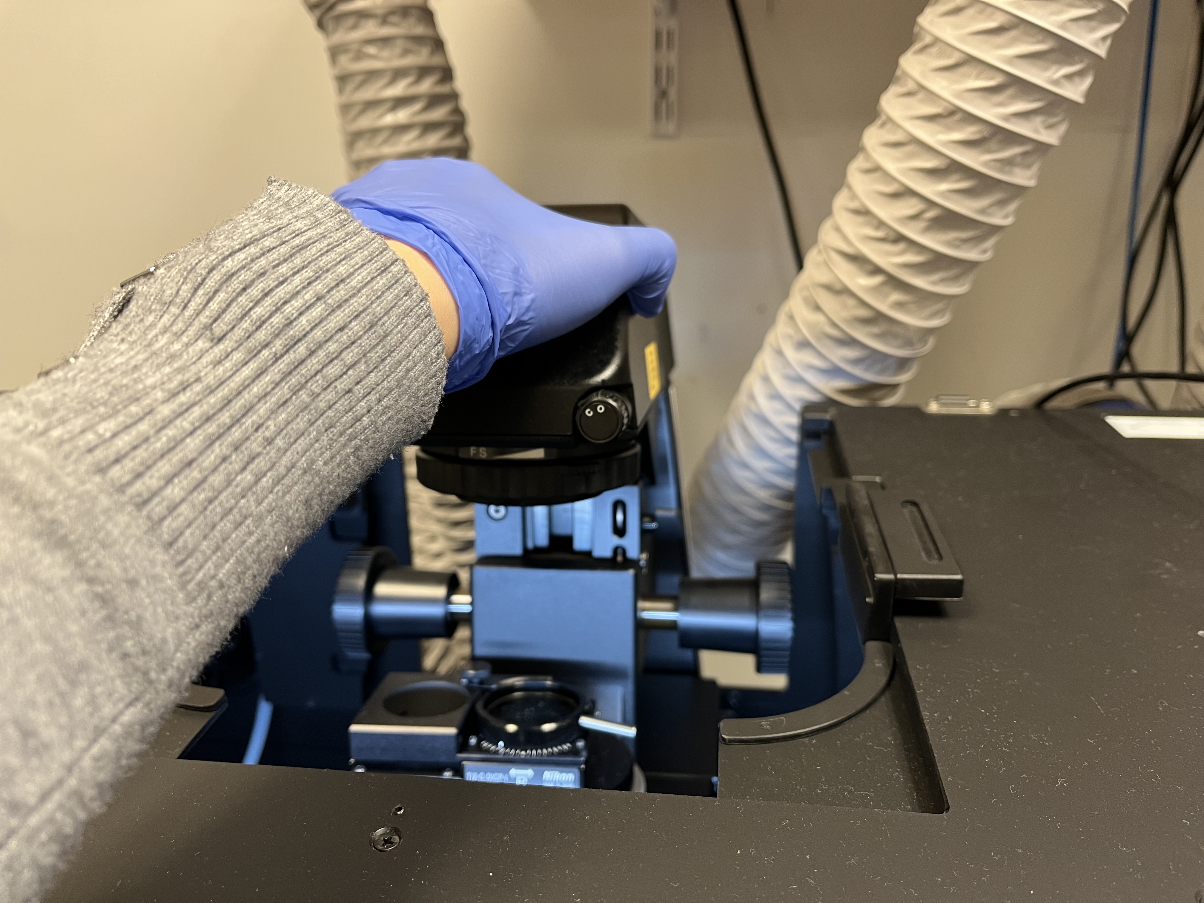 Return the microscope pillar to its normal spot and close all doors on the enclosure.