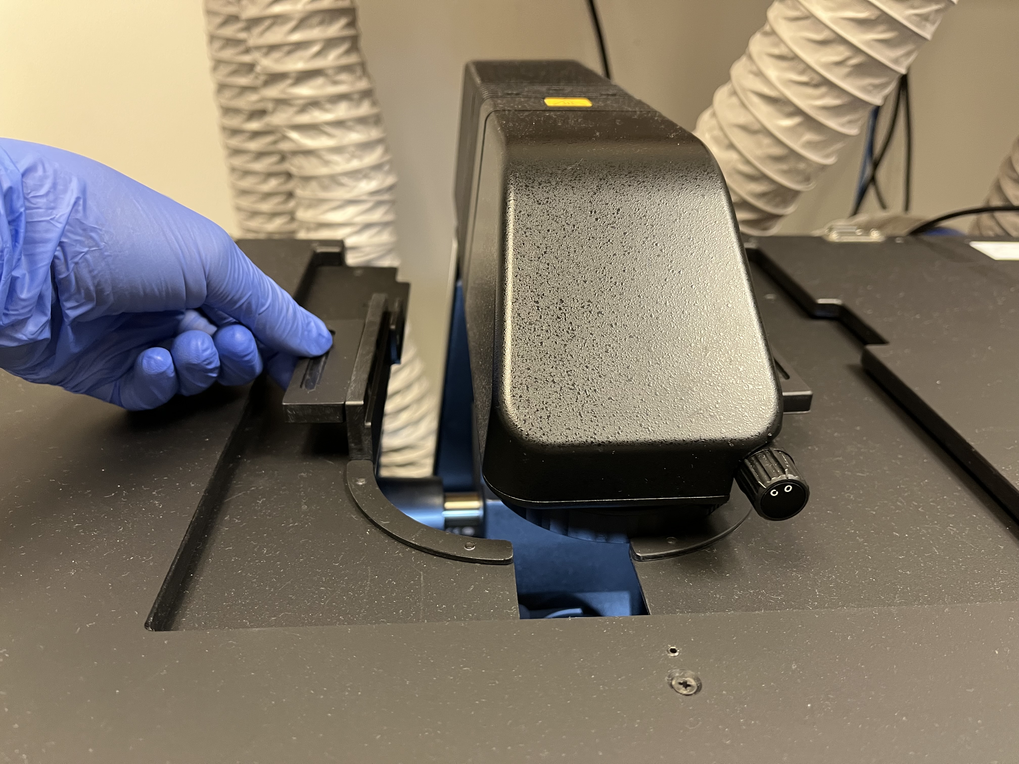 Carefully place your sample in the holder, making sure to avoid contact with the objectives or the microscope pillar. Tilt the microscope pillar back down into place and close the doors on the front and top of the enclosure. Optionally, place the magnetic cover back on the front window to block out all light.